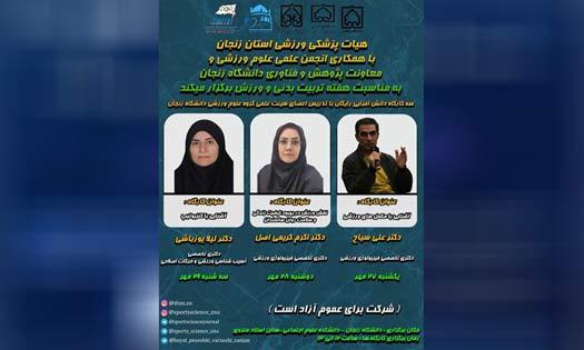 انجمن علمی علوم ورزشی دانشگاه زنجان با همکاری هیات پزشکی ورزشی استان زنجان و با همکاری معاونت پژوهشی دانشگاه زنجان، به مناسبت هفته تربیت بدنی و ورزش برگزار میکند: